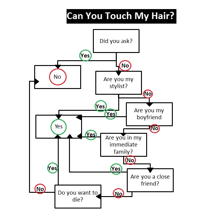 I’ve already told you all why it’s a problem, so today I am giving you a quick and easy visual aid to help you and your friends figure out when it is appropriate to touch another person’s hair. It’s pretty straight to the point. I suggest you print out a copy to pass around the office.